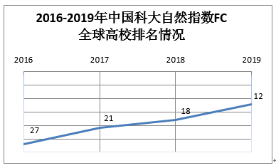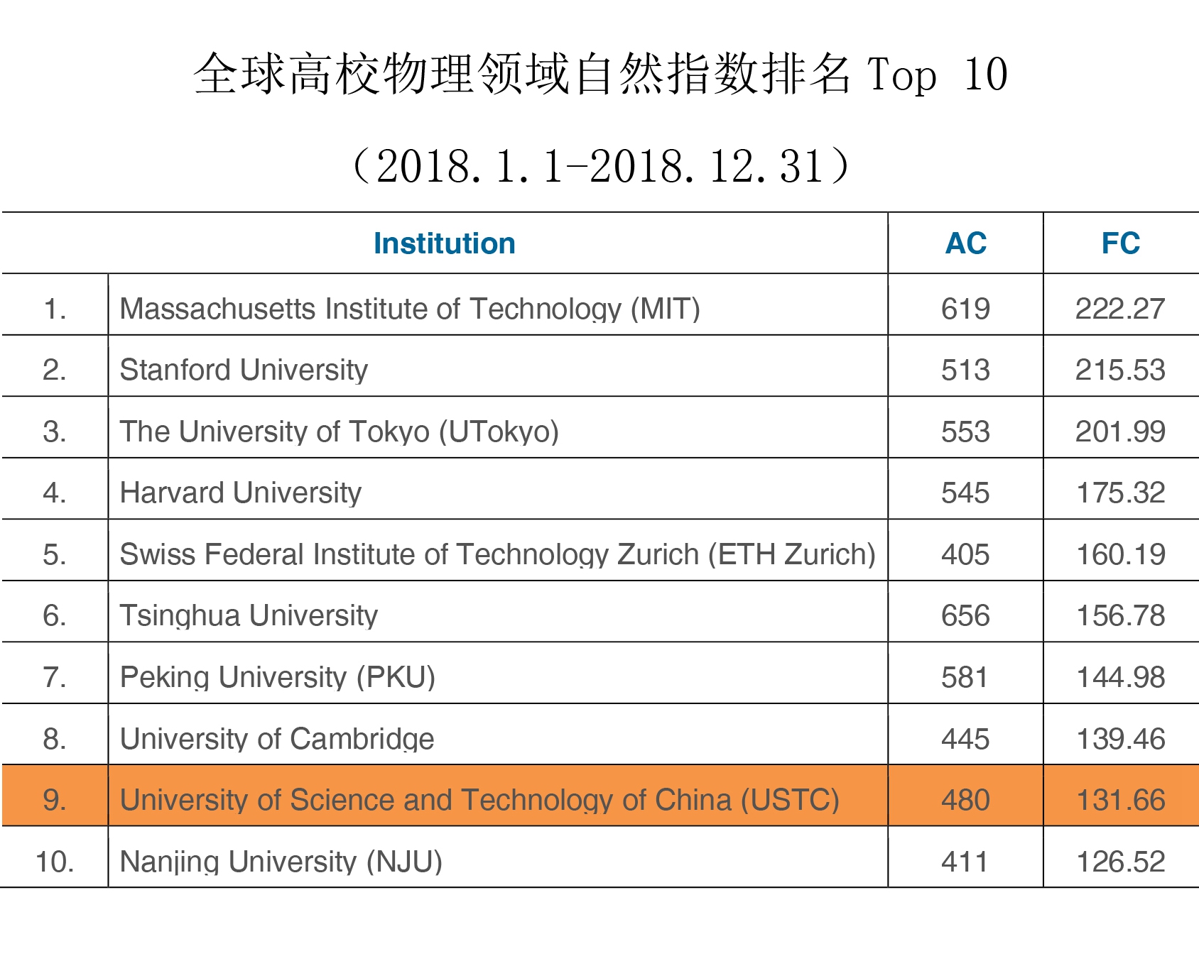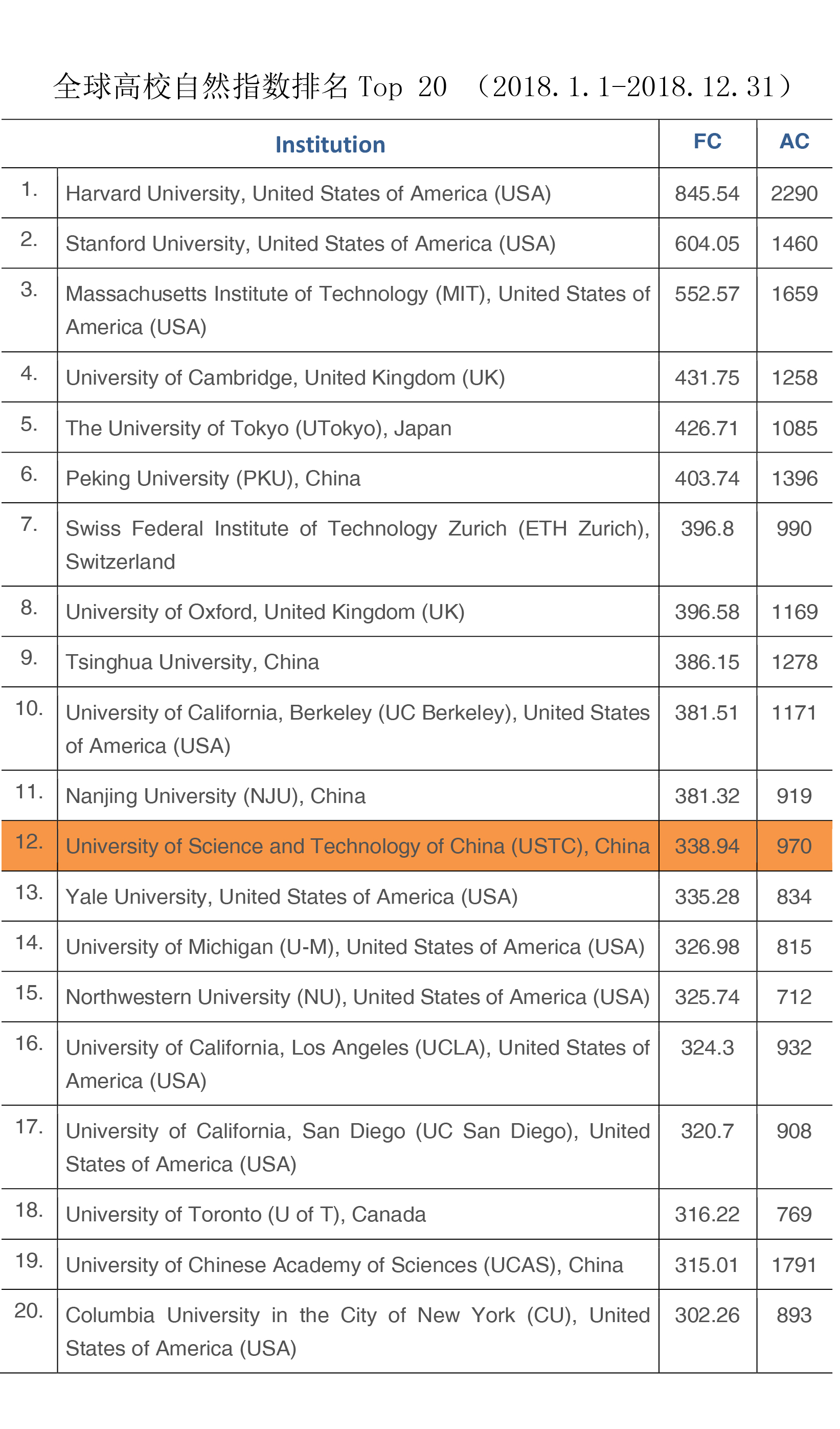 6月20日,自然指数网站更新了2019年自然指数排名。此次自然指数更新统计时间段为2018年1月1日至2018年12月31日。中国科大在82种自然科学期刊上共发表970篇论文,FC指数338.94,在全球高校中位居第12位,较2018年上升6位,在中国大陆高校位居第4位。