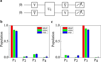两比特Deutsch-Jozsa算法实验演示图。 (a) 两比特可编程量子处理器普适量子线路图。(b) 和 (c) 两比特Deutsch-Jozsa 算法实验结果,蓝色为实验结果,红色为理想情况下的理论预期值,绿色为考虑实验体系中各类噪声影响的理论预期值。