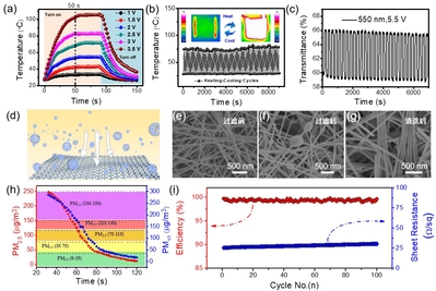 研究人员在20分钟内即可制备约7.5平方米的银纳米线-尼龙智能窗口(花费约100元),这种柔性透明智能窗口不仅能够和热致变色染料相结合改变室内的光照强度,还能够作为高效的雾霾收集器用以净化室内的空气质量。其中,空气净化效率最高可以达到99.65%,并且能够在50秒内将空气中的PM2.5的浓度从严重污染的程度(248 μg·m-3)降至优良状态(32.9 μg·m-3)。而制备得到的银线-尼龙智能窗口在雾霾收集之后,只需要简单地浸泡在乙醇中20 分钟,就可以清洗干净并再次使用,即使经过上百次的可重复循环,其净化效率依然可以保持稳定。研究结果表明,在边长达0.5 米的立方空间中,使用这种银纳米线-尼龙智能窗口,其雾霾收集效率依然可以达到99.48%。