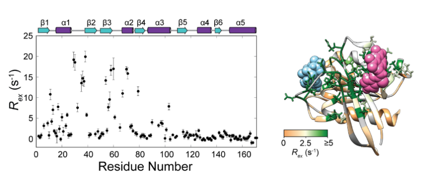 龙冬教授课题组多年从事Ras分子构象动态学研究。在之前的工作中,综合多种核磁共振弛豫实验技术定量捕捉到非活化态下Ras一项交换相关时间为34微秒的局部构象运动,并证实其与多种共价性和非共价性抑制剂分子作用口袋形成密切相关(Angew Chem, 2016)。在本次研究中,进一步阐明Ras天然活性态的构象动态属性,为完整理解及调控Ras信号转导活性奠定了重要基础。