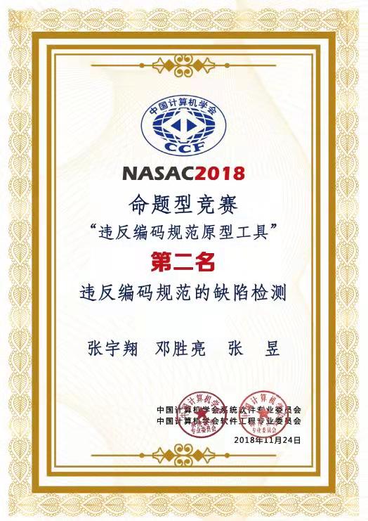第十七届全国软件与应用学术会议(NASAC 2018)于2018年11月23日至25日在深圳大学召开。在大会举办的首届“违反编码规范的缺陷检测”命题型软件原型系统竞赛现场决赛中,我校计算机科学与技术学院张昱副教授指导的、由该院一年级硕士研究生张宇翔(队长)和三年级本科生邓胜亮组成的参赛队伍,在进入决赛的5支队伍中脱颖而出,夺得亚军。该项赛事要求参赛人员熟悉程序语言的编译原理和技术,了解程序分析技术,设计和实现相关程序分析算法来识别程序代码中违反所给编码规范的缺陷。