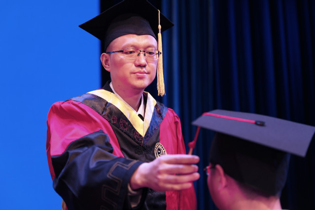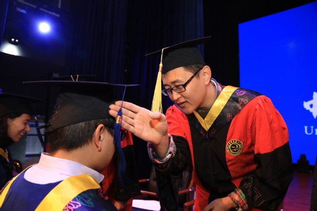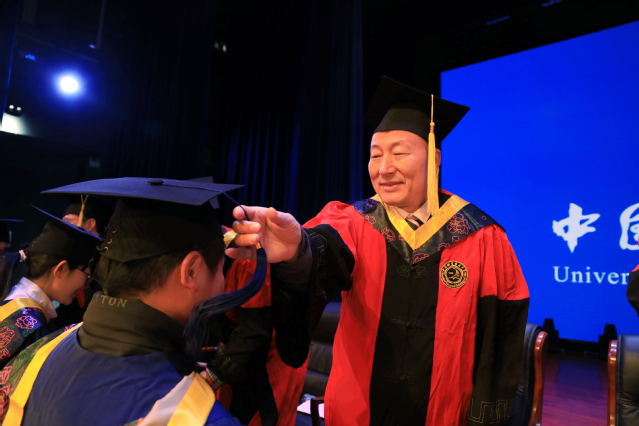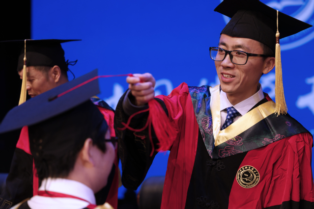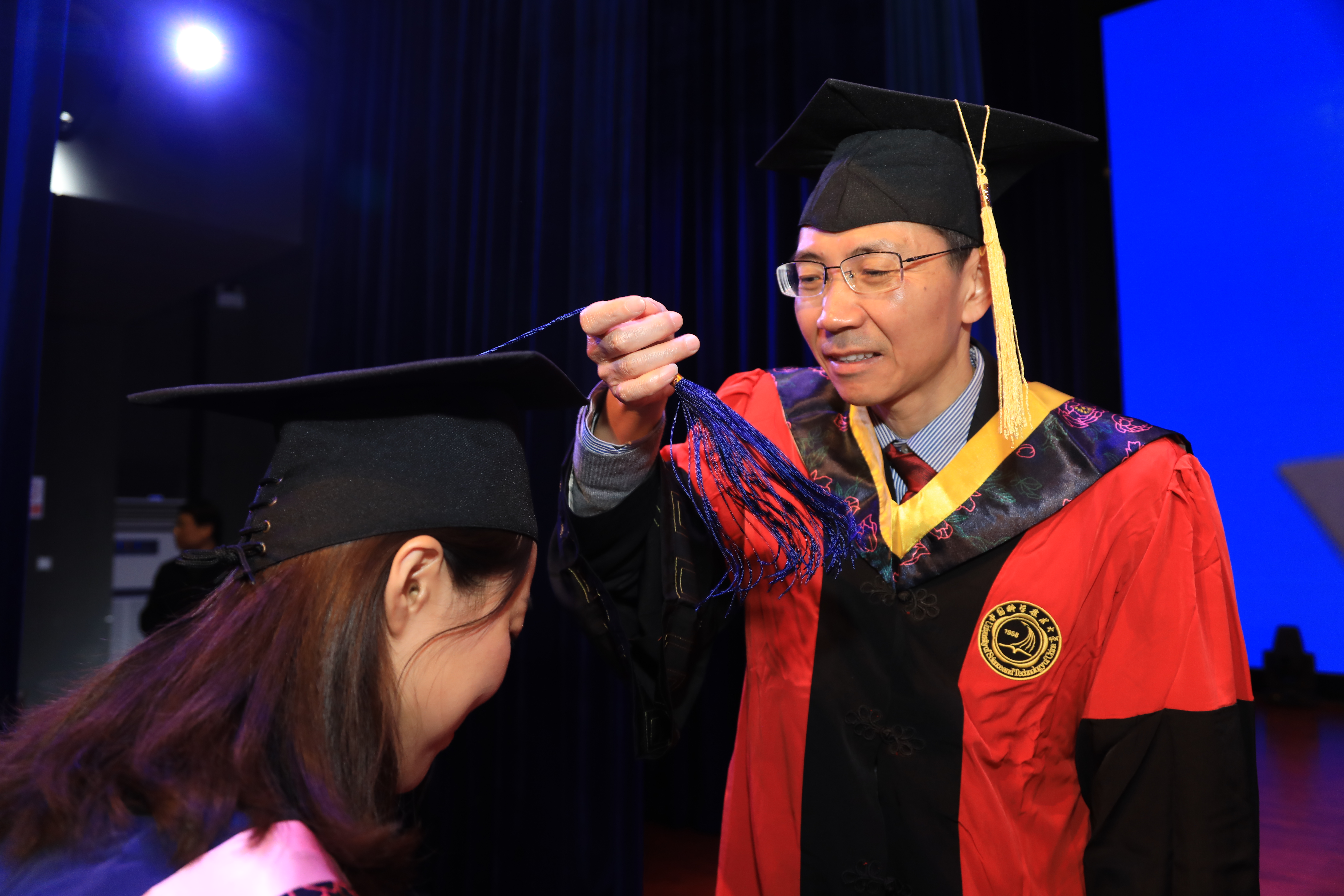 宣誓结束,全体毕业生齐声高唱校歌《永恒的东风》。在校歌声中,同学们身着学位服依次登上主席台,校领导和导师们为他们一一扶正流苏。