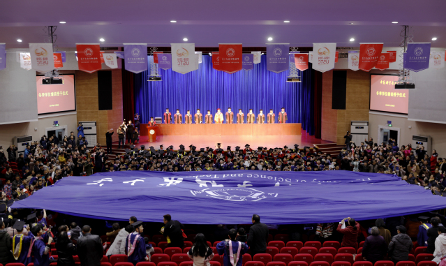12月8日上午9点,中国科大2018年冬季学位着装授予仪式在东区大礼堂隆重举行。校领导舒歌群、包信和、叶向东、杨金龙,部分学院、国家重点实验室领导陈旸、邓建松、刘明侯、陈卫东、汪毓明、宋伟、徐铜文、陆晔,以及特邀导师代表龚晨,身着导师服在主席台就坐。仪式由副校长杨金龙主持。八百余名毕业生与恩师、亲友们共同见证这一庄严时刻。