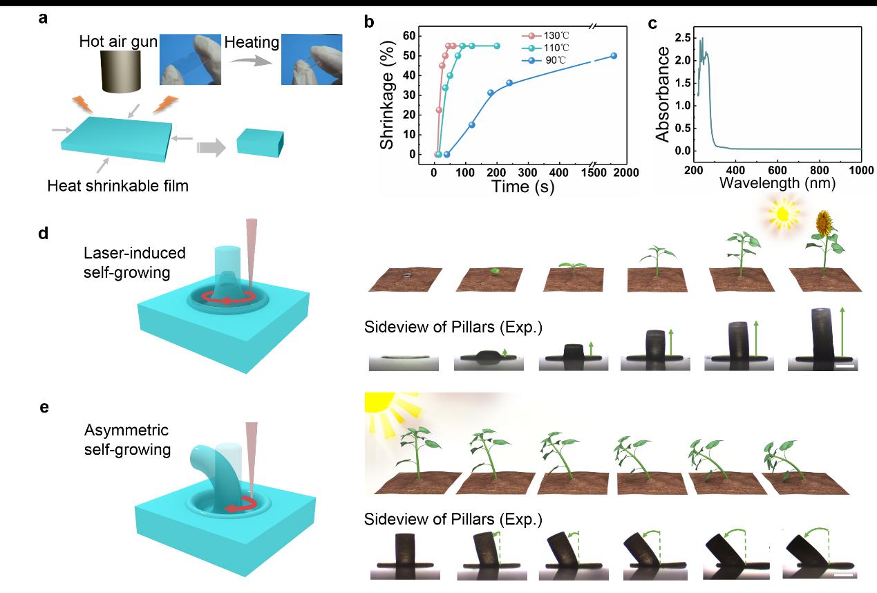 图1. (a)-(b) 热缩聚苯乙烯薄膜的收缩特性。(c) 热缩薄膜的UV-Vis光谱吸收特性。(d) 飞秒激光连续对称扫描诱导微直柱生长。(e) 飞秒激光连续非对称扫描诱导直柱弯曲。