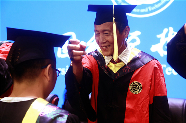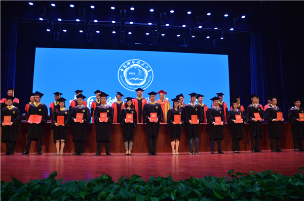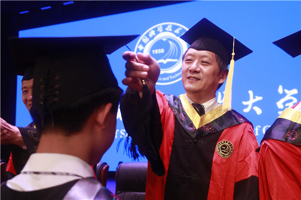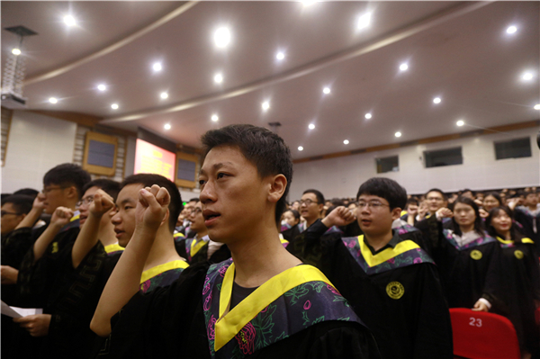 仪式上,校党委书记舒歌群带领全体毕业生庄严宣誓:“感恩父母养育,感谢导师教诲,不忘母校培养。我们坚守母校信念,热爱科学、崇尚真理;我们传承母校精神,科教报国、追求卓越。我们用激情和智慧建设祖国,用责任和行动回馈社会,用成就和硕果回报母校!”