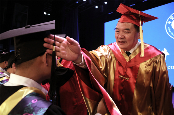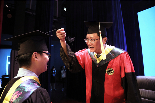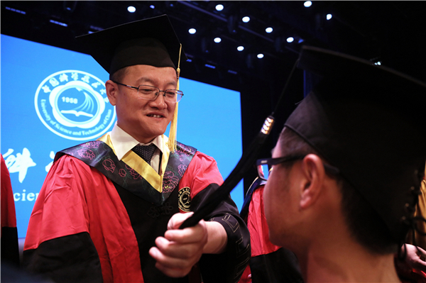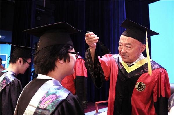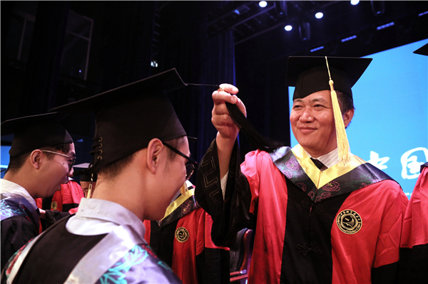 随后,毕业生依次登上主席台,校领导和导师们为他们一一扶正流苏。