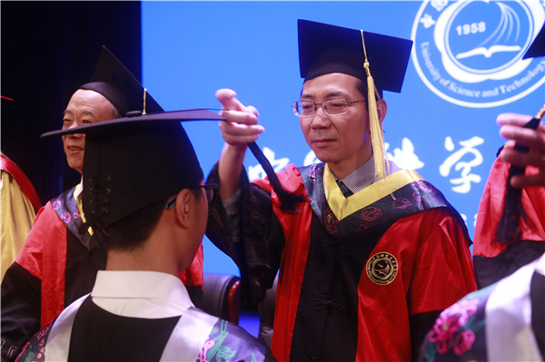 上午九点,毕业典礼暨学位着装授予仪式正式开始。校领导舒歌群、包信和、叶向东、陈初升、杨金龙、杜江峰,导师代表陈旸、李嘉禹、葛学武、陈卫东、刘斌、余玉刚,特邀校友代表李定,身着导师服在主席台就坐。毕业典礼由校党委副书记蒋一主持。