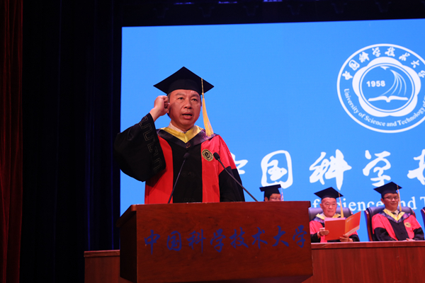 在热烈的掌声中,校学位委员会主任、校长包信和院士致辞,深情寄语即将毕业的同学们。他首先代表学校全体教职员工衷心祝贺同学们顺利完成学业、获得学士学位,并向毕业生的老师和亲友表示感谢。