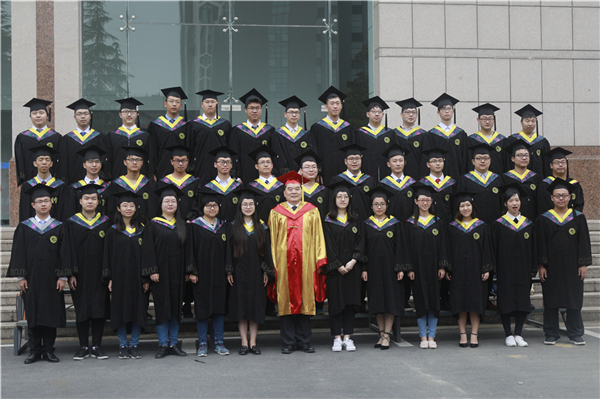 毕业典礼前,包信和校长在东区大礼堂前与毕业生合影留念。