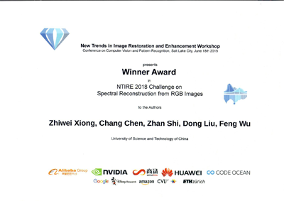 CVPR是计算机视觉领域三大顶级会议之一,NTIRE@CVPR图像恢复与重建挑战赛自2016年起每年举办一届,在以超分辨率为代表的底层视觉处理领域具有重要影响力。NTIRE 2018光谱重建挑战赛共有来自美国、欧洲、中国、印度等国家和地区的九支队伍参赛。在该挑战赛的两项子任务中,熊志伟教授团队提出的基于200层密集融合网络与残差网络的光谱重建方案包揽前两名,从而获得冠军。