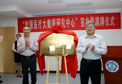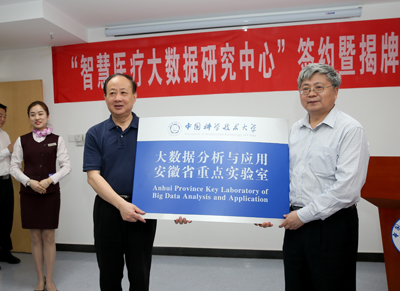 许戈良与陈恩红代表双方签署共建“智慧医疗大数据研究中心”合作协议。朱长飞代表大学向许戈良授牌“大数据分析与应用安徽省重点实验室”,并与刘同柱一起共同为“智慧医疗大数据研究中心”揭牌。