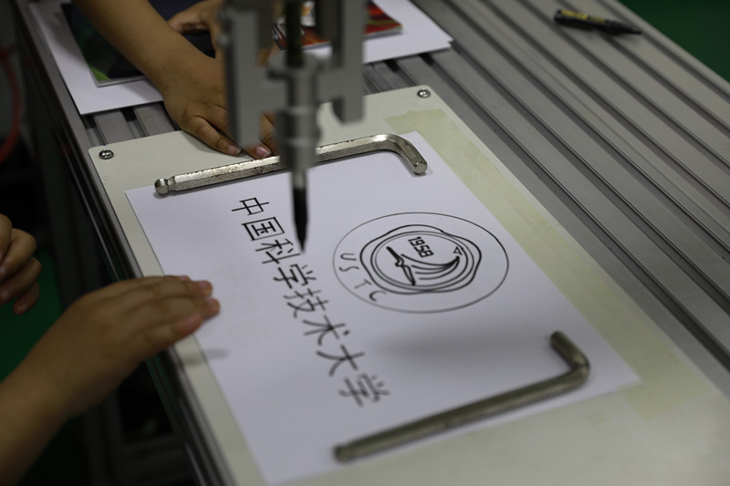 工程科学学院科普点有智能机器人、3D打印、三维扫描、激光内雕、工业机器人、航模等项目的体验展示。进入工业机器人展场地,入目即是一台正在完成写字任务的工业机器人,纸上不断描画着科大校徽,书写着“中国科学技术大学欢迎你!”,让参观者充分感受到来自科大的热情。