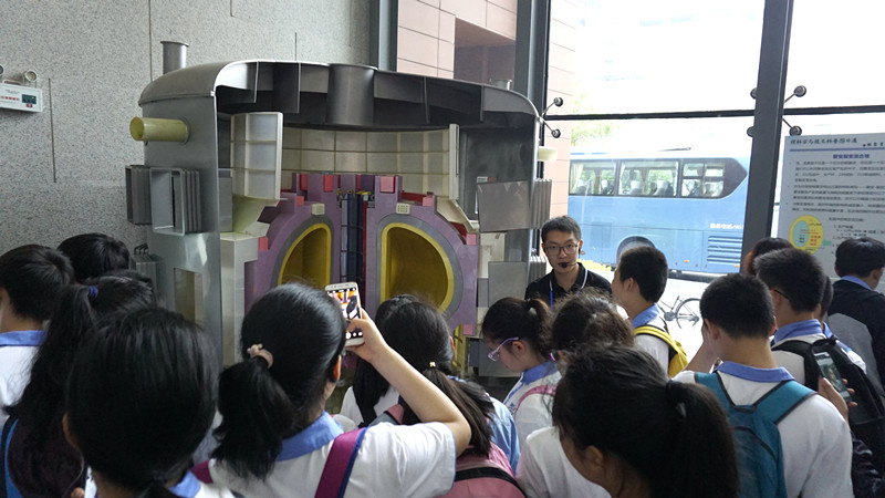 核科学技术科普点精心制作了科普展板,既详细介绍了核能发展的历程和最新进展,又向公众介绍了核技术的广泛应用。此外,本次展出的三个科学实验装置模型——裂变电站及汽轮机模型、聚变堆模型和混合堆模型更加直观,吸引了大批观众,当大家得知聚变堆就好像是一个“人造太阳”时,都为如此伟大的科技所震惊。在辐射现象现场演示科普点,参观者纷纷拿出自己的手机检测电磁辐射强度,志愿者耐心地为大家检测并温馨提示手机在拨出号码的时刻电磁辐射较强,建议大家不要立刻把手机放在耳朵旁边。今年继续开放了CFETR(中国核聚变实验堆)协同设计平台的虚拟现实演示,最先进的科学和最尖端的技术相结合,给公众带来一个全方位的展示,让前来参观的家长和同学纷纷表示大开眼界。