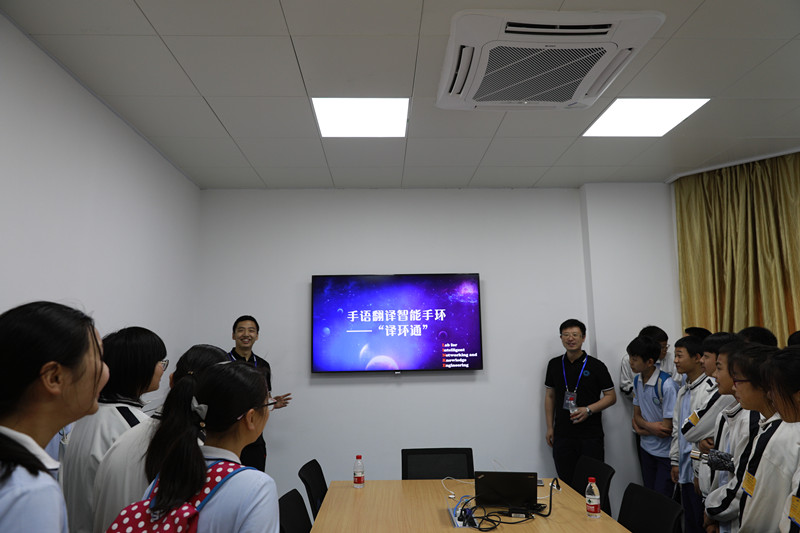 在计算机科学与技术学院科普点,机器作诗秀引起大家的阵阵惊叹和叫好;而译环通则是利用智能手环和人工智能技术,将动作手势转换为声音或文字信号,将为“失语者”群体提供人工智能驱动下的人文关怀。