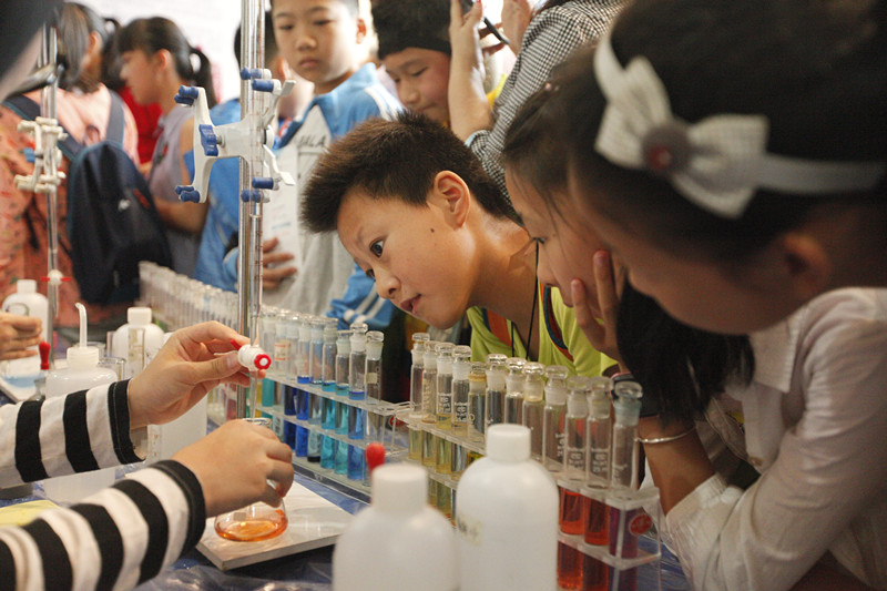在东区,化学与材料科学学院的活动主题是“诗歌与化学”,推出了吉祥物“小雪”与“小华”,前来参观的孩子们纷纷在吉祥物照片墙前合影留念。在一楼大厅里,摆放着化学科普知识展板,最受欢迎的项目则是趣味化学实验:有神奇的滴定实验、茶水墨水、泡泡糖去哪儿了、会“生气”的可乐、液滴接力等。现场有多名学生志愿者,耐心地给小朋友们讲解科普原理、演示科学实验。在志愿者的讲解和指导下,前来参观的小朋友们纷纷动手体验,感受化学世界的无穷乐趣。更吸引人的是,参加完趣味小实验还能收集印章,兑换主办方精心准备的科大纪念品。在资环楼报告厅内,火爆的“化学秀”——《一起来上一堂化学魔术课》吸引了多家媒体进行现场直播。三楼至七楼的化工、物化、分析化学、有机化学等实验室也对参观者开放,并有志愿者讲解。