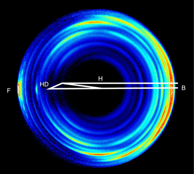 气相化学反应严格意义上来说就是原子分子的散射过程,比较特别的是在这一散射过程中有旧的化学键形成和新的化学键形成的过程。散射动力学研究尤其是散射产物角分布的测量是研究气相分子反应机理非常重要的途径。前向散射在很多直接化学反应中都存在,但是其反应的机理迄今为止并不清楚。近年来,速度成像技术成为研究化学反应机理一个非常重要的实验方法。由王兴安教授和杨学明教授领导的团队在中国科技大学化学物理系化学反应动力学实验室研制了一台独特的利用阈值电离技术以及速度成像技术相结合的交叉分子束反应动力学研究装置,使得H原子产物的速度分辨率达到了世界上同类仪器最好的水平。利用这一装置,研究小组对化学中最经典的H+HD?H2+D反应的开展了精确的实验动力学研究。 他们首次测得了这一反应产物全量子态分辨的散射图像(图二),