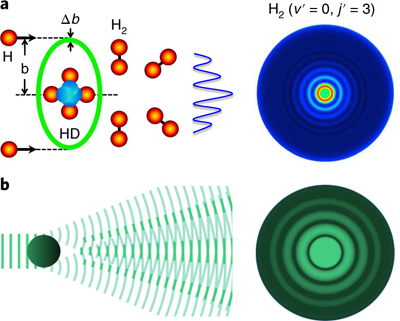 并且在实验上首次观测到了反应前向散射产物中存在的角分布振荡现象。中科院大连化物所孙志刚、张东辉研究员通过精确量子动力学计算和分析,发现这一角分布振荡现象其实是由于散射过程中的分波散射的角分布结构引起的。通过这些振荡结构测量,我们可以了解到造成前向散射的反应过渡态和中间体的大小,也可以知道这些前向振荡结构是由哪几个分波散射所造成的。这样的前向散射反应机理在许多气相化学反应中存在,因此这一研究工作对于气相化学反应机理研究具有普遍的意义。通过他们进一步研究发现,这些在化学反应中首次发现的前向散射振荡结构在三维散射图像中与大气光学中观测到的日冕环的散射图像非常相似(图三)。通过观测光与水滴的日冕环散射,我们可以了解自然界大气中水滴的大小;而通过观测化学发应中的前向角分布振荡结构,我们可以清晰地研究化学反应的过渡态结构及相关动力学。