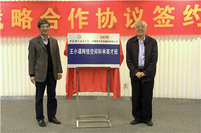 在双方领导的见证之下,潘建伟院士与吴曼青院士签署了《中国科学技术大学与中国电子科技集团有限公司战略合作协议》。随后,陈初升副校长与被誉为“中国预警机之父”的王小谟院士共同为“王小谟网络空间科学英才班”揭牌。该英才班的重要使命是为国家探索高端网信人才培养的新体制、新机制,为在网络安全方面具有特殊培养潜质的青少年提供一个更好的成长和成才环境。