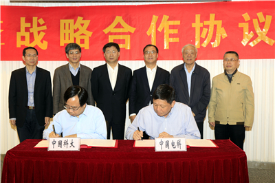 4月26日,中国科学技术大学与中国电子科技集团有限公司战略合作协议签约仪式暨王小谟网络空间科学英才班揭牌仪式在我校理化大楼科技展厅举行。中国科大党委书记许武会见了中国电科总经理、党组副书记刘烈宏一行。出席签约仪式的有:中国电科副总经理、党组成员吴曼青院士,王小谟院士,陆军院士;中国科大常务副校长潘建伟院士,副校长陈初升,校长助理杨金龙。参加仪式的还有中国电科发展规划部、人力资源部、科技部、资产经营部、电子科学研究院、三十八所、重庆声光电有限公司,中国科大党委组织部、科研部、教务处、少年班学院、网络空间安全学院、计算机学院、信息学院、大数据学院、微电子学院等单位负责人。