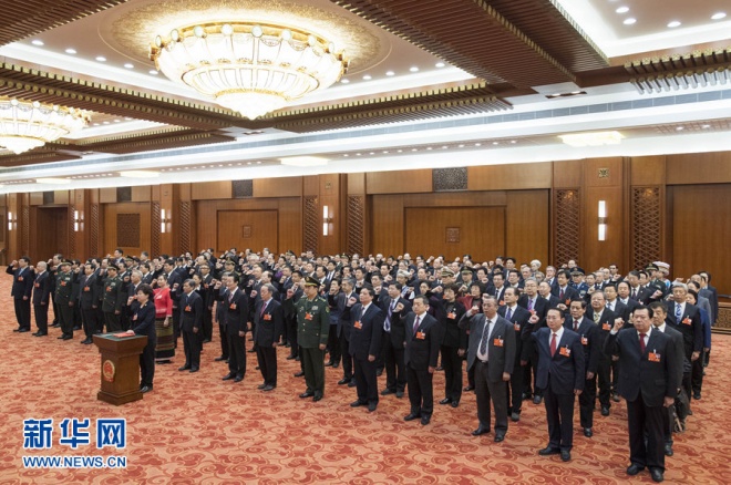新当选的第十三届全国人民代表大会常务委员会委员进行宪法宣誓