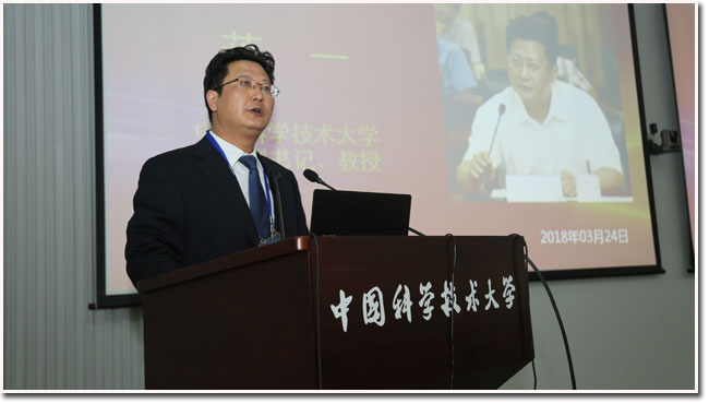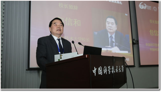 包信和校长首先对获奖同学表示热烈祝贺,并对远道而来的各位家长和老师表示欢迎和感谢。他对同学们提出两点殷切期望:一是始终胸怀报国之心,心系责任担当。今年是中国科大建校60周年,作为我党亲手创办的一所红色大学,我们始终与共和国同呼吸、共命运,“红专并进一甲子,科教报国六十年”。“科教报国”和“创新立校”的基因融入科大的文化血脉,“红专并进、理实交融”的校训精神代代相传,“将红旗插上科学的高峰”写进校歌,成为一代代科大人的“初心”。习近平总书记在刚刚闭幕的第十三届全国人大第一次会议的讲话中指出:“新时代属于每一个人,每一个人都是新时代的见证者、开创者、建设者。”希望同学们今后不论身处何方,都能牢记,你们代表的是母校——中国科大、是祖国——中华人民共和国,今天的获奖不仅仅是一份荣誉,更是一份沉甸甸的责任,意味着你们要不忘科大人的“初心”,志存高远,敢于担当,开拓创新,为实现中华民族伟大复兴的中国梦而勇攀高峰。 二是始终保持好奇之心,微笑面对生活。包信和校长以霍金和我校第33届郭沫若奖学金获得者、年仅21岁的2010级少年班校友曹原为例,鼓励同学们永远保持一颗好奇之心,勇于探索未知世界,豁达面对人生挫折,心怀感恩,笑对生活。霍金身困轮椅却行至宇宙尽头,口不能言却道尽自然至理,凭借顽强的意志和惊人的才华,在轮椅上完成了人类最为壮阔的探索和想象;曹原在石墨烯超导电性研究中的重大发现一天之内在《Nature》上发表了两篇文章,轰动国际学术界,曹原成为《Nature》杂志创刊149年来以第一作者身份发表论文的最年轻中国学者。希望同学们坚持在求真途中不断探索、不断前行,用自己的方式诠释人生的意义和思考的价值。