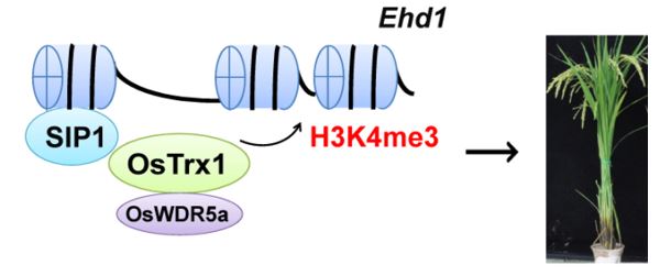 水稻OsTrx1是TRX类蛋白,具有H3K4me3甲基转移酶活性。研究发现,OsTrx1与锌指蛋白SIP1相互作用,SIP1特异地结合开花靶基因Ehd1启动子15 bp的DNA序列,SIP1招募OsTrx1至Ehd1位点,完成H3K4me3修饰,并促进转录,完整地解释了功能缺失的SIP1和OsTrx1具有的早花表型。进一步研究发现,OsTrx1酶单独作用时甲基化效率低,OsTrx1甲基转移酶活性需要OsWDR5a辅助,OsWDR5a与OsTrx1相互作用后,提高OsTrx1催化H3K4me3修饰效率。在OsWDR5a功能缺陷条件下,即使OsTrx1结合Ehd1,也不能完成该位点H3K4me3修饰,解释了OsWDR5a功能缺陷,亦能导致与ostrx1类似的晚花表型。此外,功能下调控的OsTrx1和OsWDR5a不仅能调节水稻开花时间,而且影响二级枝梗数。该研究发现了组蛋白修饰甲基转移酶特异性修饰靶基因的分子机制,也为农作物性状改良提供分子基础。