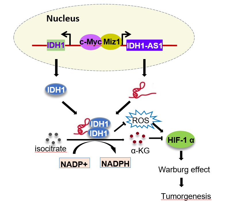 癌基因c-Myc是常氧条件下调控糖酵解的主要因子,在肿瘤细胞中的作用尤为显著;而低氧诱导因子HIF1α通常是在低氧条件下才能被诱导表达用以调控糖酵解。但有不少研究发现,即便是在常氧条件下HIF1α也有着较高的表达水平。这两个瓦博格效应的核心调控因子之间有着怎样的联系,迄今仍然没研究清楚。吴缅研究组发现,在常氧条件下,c-Myc通过转录抑制长非编码RNA IDH1-AS1,后者再通过IDH1,调控HIF1α的活性。IDH1-AS1能结合IDH1并促进其二聚化以提高其酶活,而c-Myc转录抑制IDH1-AS1的表达,所以c-Myc通过抑制IDH1-AS1来降低IDH1的活性,从而导致α-KG产量的减少和ROS水平的上升,这两个因素协同稳定HIF1α,使其表达水平升高。通过上面的机制,在常氧条件下c-Myc能够增加HIF1α的表达,从而共同调控瓦博格效应。c-Myc和HIF1α的关键纽带是长非编码RNA IDH1-AS1。进一步的实验表明,IDH1-AS1能够抑制细胞的增殖和裸鼠成瘤能力,这意味着IDH1-AS1具有潜在的抑癌效应,可能会成为一个有潜力的肿瘤代谢治疗靶点。