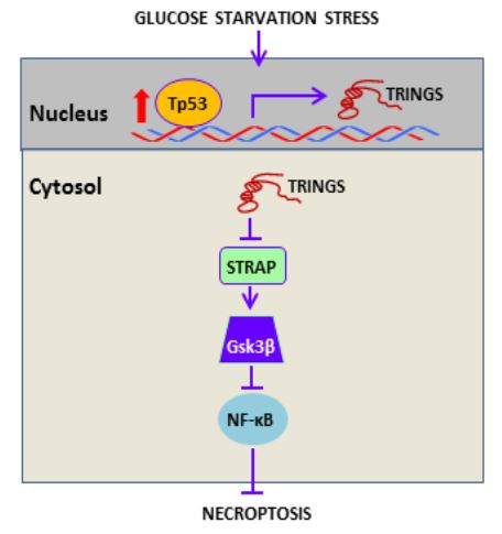 在人类近一半的肿瘤中,p53是突变的。但是,在另一半p53野生型的肿瘤中,p53到底扮演了什么样的角色,仍然不清楚。肿瘤因为具有Warburg effect,所以它偏爱产能较低的葡萄糖酵解。从理论上讲,在葡萄糖饥饿情况下,肿瘤细胞应该不容易存活。但肿瘤细胞能依靠代谢重编程使之能很好地适应不利环境。研究组发现p53可通过调控一条长非编码RNA来保护肿瘤细胞更好地存活,并且阐明了一条全新的以NFkB为终点的信号通路。他们发现在葡萄糖缺失情况下,p53诱导TRINGS的表达,TRINGS与GSK3β竞争结合一个称为STRAP的细胞凋亡蛋白,使GSK3β第9位的Ser磷酸化增加,继而稳定NFKB,导致细胞更多的存活。该研究第一次证明了非编码RNA TRINGS介导的信号通路与经典的RIP1-RIP3-MLKL程序性坏死不同,TRINGS诱导的STRAP-GSK3β-NFKB是非经典的程序性坏死通路。