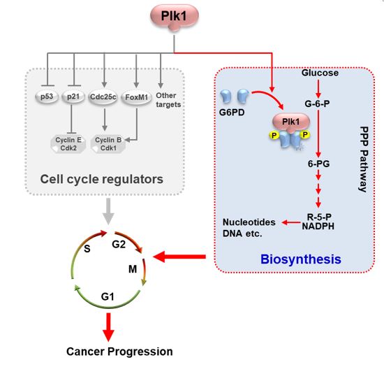 肿瘤代谢重编程和细胞周期调控异常是肿瘤的两个重要特征,然而人们尚不清楚这两者之间如何相互协调以促进肿瘤细胞的增殖和肿瘤的发生发展。课题组首次发现在肿瘤细胞中, 重要的周期调控蛋白Plk1在周期进程中调节磷酸戊糖途径的关键代谢酶G6PD的活性,并进而促进生物大分子合成以及肿瘤细胞在体内外的增殖。进一步的机制研究发现Plk1通过结合并磷酸化修饰G6PD,使得G6PD形成二聚体增多,从而促进酶活性以及整个磷酸戊糖途径。增强的磷酸戊糖途径对于肿瘤细胞的周期进程以及肿瘤的发生发展有重要的促进作用。因此,该研究首次发现了周期调控蛋白Plk1在调节生物大分子合成方面的新功能,揭示了代谢重编程与周期调控相互协调共同促进肿瘤细胞快速增殖的新机制,对临床肿瘤的靶向治疗有潜在的指导意义。