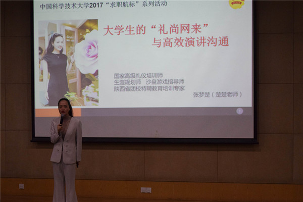 5月10日晚,由校团委、校研究生会、数学科学学院分团委主办,数学科学学院研究生会承办的“礼尚网来”礼仪培训活动在东区环境资源楼报告厅举行。本次培训邀请到了国家高级礼仪讲师、生涯规划师、沙盘游戏指导师、陕西省团校特聘教育培训专家、长颈鹿读书会创始人张梦楚老师为同学们讲解礼仪。