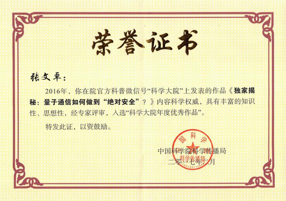 此外,中国科大管理学院赵征老师《与女儿谈管理》获“2016年中国科学院优秀科普图书”;合肥微尺度物质科学国家实验室张文卓老师在院官方科普微信号“科学大院”上发表的作品《独家揭秘:量子通信如何做到“绝对安全”?》入选“科学大院年度优秀作品”。