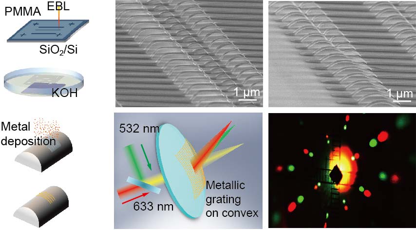 传统的自上而下微纳加工手段(包括深紫外曝光、电子束曝光以及X射线曝光等技术)在现代微电子产业和光学器件的发展中发挥了重要作用,但受限于这些技术本征的工艺特征,无法达到日益迫切的非平面加工要求。团队利用水解转移的方式将带有纳米图案的光刻胶薄膜作为蜡纸印刷术掩膜,利用薄膜的柔性保形特征包裹在曲面和非平整衬底之上,辅以图形转移手段,成功实现了具有多维度的微纳米结构,特别是三维波浪形超结构的可控制备。这种新方法继承了传统微纳米曝光技术在大通量、高分辨率等方面的优势,极大拓展了这些传统技术的功能,在超材料、曲面光栅、局域场器件以及柔性器件等方面展示出重要应用前景。