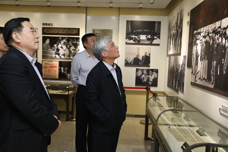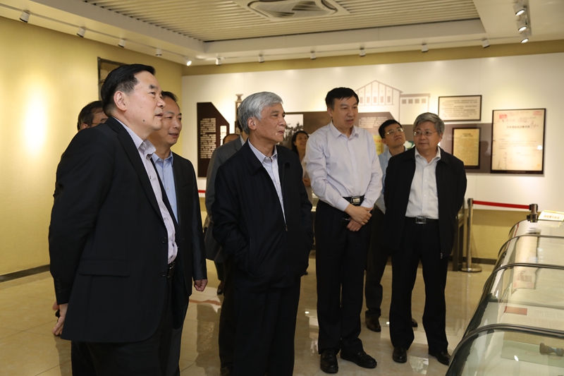丁仲礼一行先后到校史馆和科教成果展厅参观考察。中国科大党委书记舒歌群、校长包信和等校领导陪同参观。在校史馆各展厅,丁仲礼仔细观看展出的照片、实物及文字介绍,不时向讲解员询问相关情况。在观看玉泉路校区照片时,丁仲礼饶有兴致地讲解起老校区的建筑布局情况。在“南迁重建”展厅,当看到八十年代学生的求学照片时,丁仲礼与同行人员回忆交流了自己的大学时光。