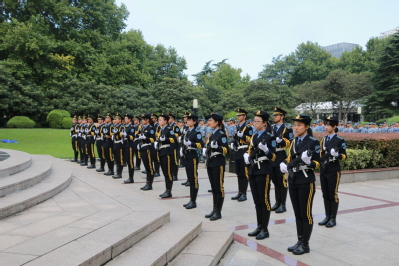 升国旗现场,伴随一声响亮的“出旗!”,队员们护着鲜红的国旗和蓝色的院旗、校旗,迈着整齐而矫健的步伐走向旗台。国旗仪仗队步伐铿锵有力,口号整齐划一,气氛庄严肃穆。