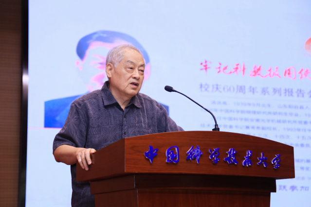 在报告中,汤洪高教授首先表达了对科大60周年校庆的祝贺。他说,退休十多年后,受邀前来作科大精神报告,是一次难得的温故和知新的机会。报告中,他结合自己在中国科大工作期间的亲身经历,向在场师生分享了他对科大精神的理解。他从中国科大的历史沿革谈起,以小见大,用一个个生动的故事,讲述老一辈科学家在艰苦的办学环境中取得的辉煌成果;用一段段真实的体验,阐发自己对中国科大的深厚感情。