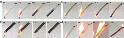 易燃性是天然木材在实际应用中面临的最大问题,而防火阻燃则是人工木材最大的优点,而且通过复合不同的纳米材料可以进一步提高其防火隔热性能。这种人工木材具有很好的防火性能,在火焰引燃后能够迅速自熄灭,而这正是天然木材无法克服的缺点(图3)。
