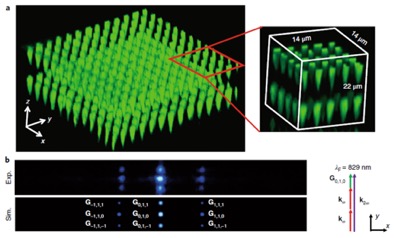 中国科学院材料力学行为和设计重点实验室吴东教授课题组与南京大学固体微结构国家重点实验室张勇、肖敏课题组以及胡小鹏、祝世宁课题组合作,利用飞秒激光电畴擦除技术首次成功制备出三维非线性光子晶体,并实现了三维准相位匹配的激光倍频。相关成果近期以“Experimental demonstration of a three-dimensional lithium niobate nonlinear photonic crystal”为题,8月20号在线发表在国际权威光学期刊Nature Photonics [doi:https://doi.org/10.1038/s41566-018-0240-2] 上。