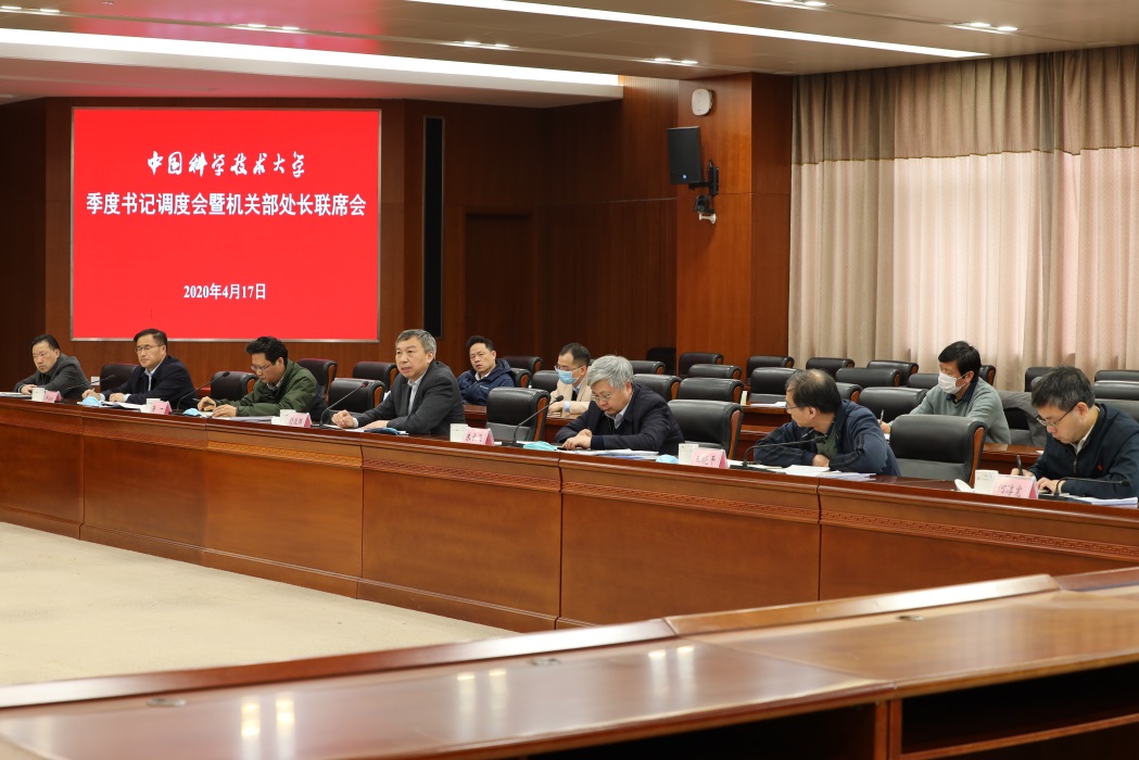 4月17日上午,学校召开2020年第二季度书记调度会暨机关部处长联席会,校党委书记舒歌群、校领导朱长飞、蒋一、王晓平、毕金初、何淳宽、褚家如出席会议,各院级党组织书记、机关各部处室主要负责人参加会议。会议由党委常委、副校长、机关党委书记朱长飞主持。