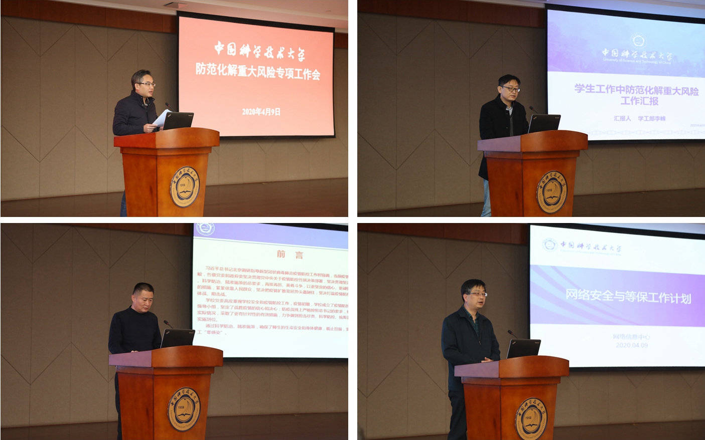 党委宣传部常务副部长、新闻中心主任朱霁平,学生工作部(处)长李峰,保卫与校园管理处处长洪军,网络信息中心主任李京分别就意识形态、学生安全、校园安全管理、网络安全等方面防范化解重大风险的重点工作安排进行了汇报,与会人员就相关问题进行了交流与讨论。