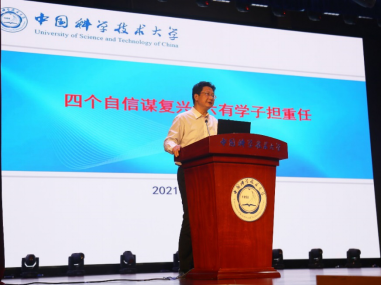 开班仪式后,校党委常务副书记蒋一为学员做题为《四个自信谋复兴 六有学子担重任》的首场报告。报告分为开启新时代、踏上新征程,理性看待国家发展,不平凡的复兴之路,坚定和增强“四个自信”四部分内容。他简要解读了十九届五中全会精神,以中国历史盛衰周期表切入,通过对比分析了主要国家的社会制度和经济状况,引导学员们理性深入看待国家发展现状和在世界百年未有之大变局中所面临的机遇与挑战,并用疫情防控等大量鲜活有力的事例阐述了中国已进入不平凡的复兴之路。也期望学员们通过聆听感悟,能进一步坚定“四个自信”,尤其是文化自信,积极践行社会主义核心价值观,传承好科大精神,争做新时代“六有”大学生,为建设社会主义现代化强国贡献自己的青春力量!