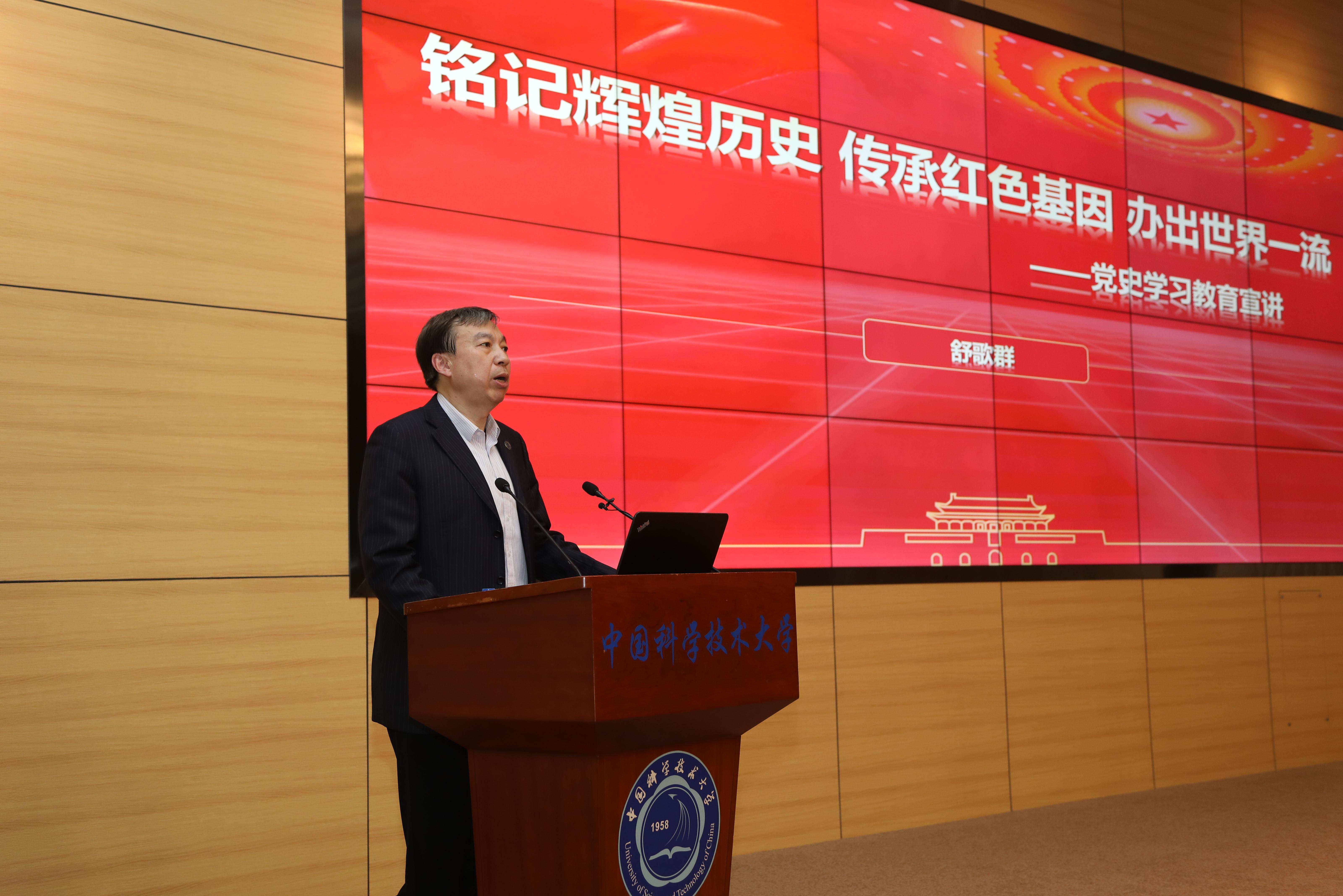 舒歌群带领大家深入学习领会了习近平总书记关于党的历史的重要论述,以五四运动、中国共产党的成立、社会主义制度的建立、社会主义现代化建设局面的形成、十八大以来我国取得决定性成就、中华民族伟大复兴的中国梦为主线,全面讲解了中国共产党百年奋斗的光辉历程和历史性贡献,重点阐述了中国科大的成长与抗大精神、“两弹一星”精神的紧密联系,并从中国科大老一辈科学家赵忠尧、郭永怀、钱学森、严济慈、钱临照的感人事例出发,勉励大家继承和发扬老一辈科学家精神、勇担时代重任。