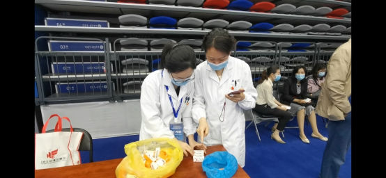 护理部的查青霜护士长也是一位老党员,每天她一来到接种点,就会穿上工作服,一刻不停的忙碌起来,有时她推着物资分发车到各个接种区发放接种物资,有时她在接种区给师生接种疫苗,有时她又推着小车为现场的工作人员发放牛奶补充体力,一天的工作快结束了,查护士长又要拿着冷藏箱到各个接种点统计回收没有用完的疫苗。