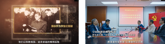 该片以钱学森、郭永怀等第一代科学大师作为起点,深情阐述“两弹一星”精神与“立德树人”思想在科大的诞生与传承,并对我校多位教师代表进行访谈,访谈对象包括校长包信和,党委书记舒歌群,空间物理教师党支部(教育部首批“双带头人”教师支部书记工作室),国家级教学名师程福臻,安徽省优秀教师、安徽省高校优秀辅导员黄松筠,国际超导材料领域Matthias奖,国家自然科学一等奖获得者陈仙辉,全国抗击新冠肺炎疫情先进个人魏海明。