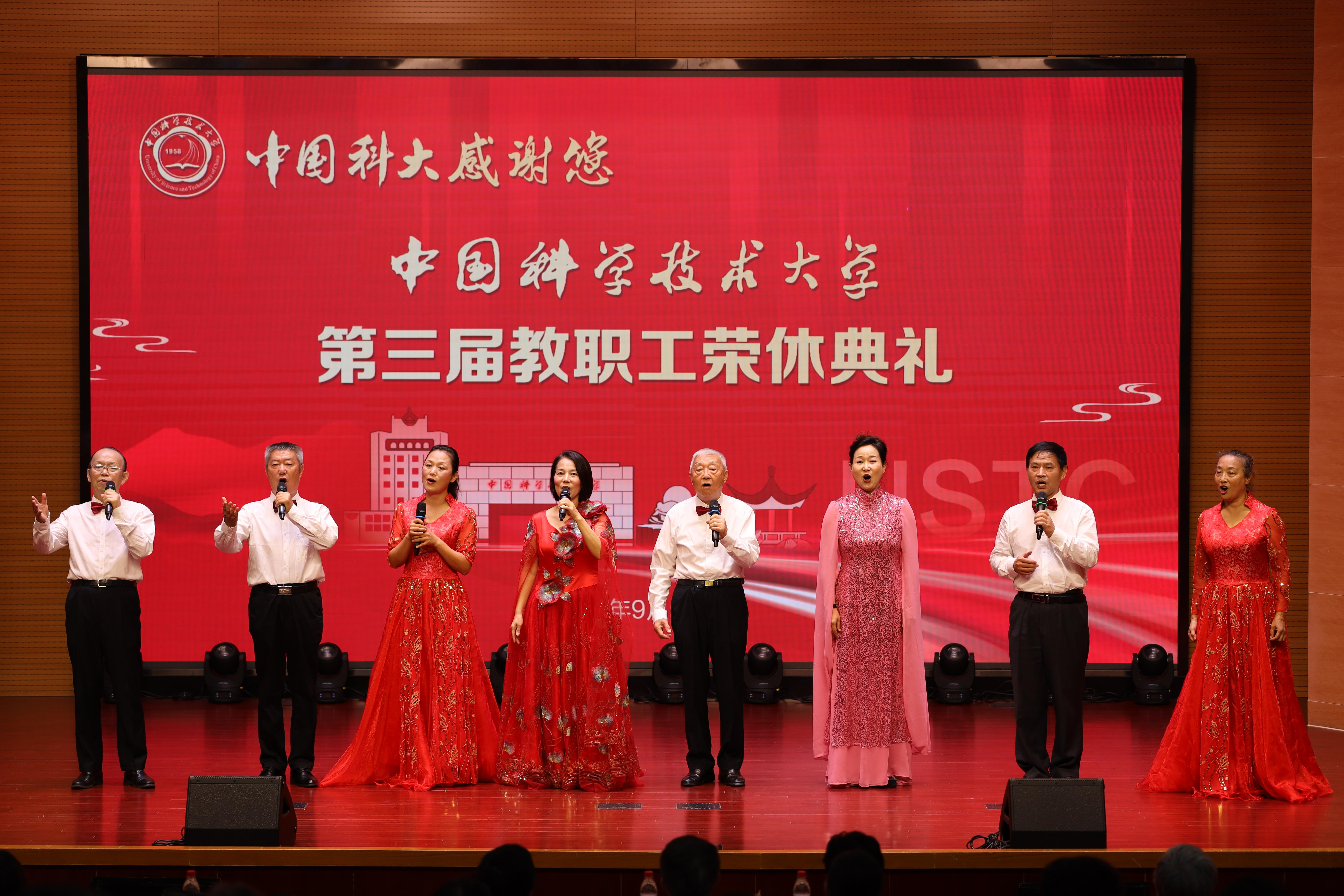 水上报告厅的屏幕上,醒目地写着“中国科大感谢您”,向荣休教职工表示感谢、传达敬意。荣休典礼在金秋合唱团优美动听的歌曲《金梭和银梭》以及红歌联唱中开始。