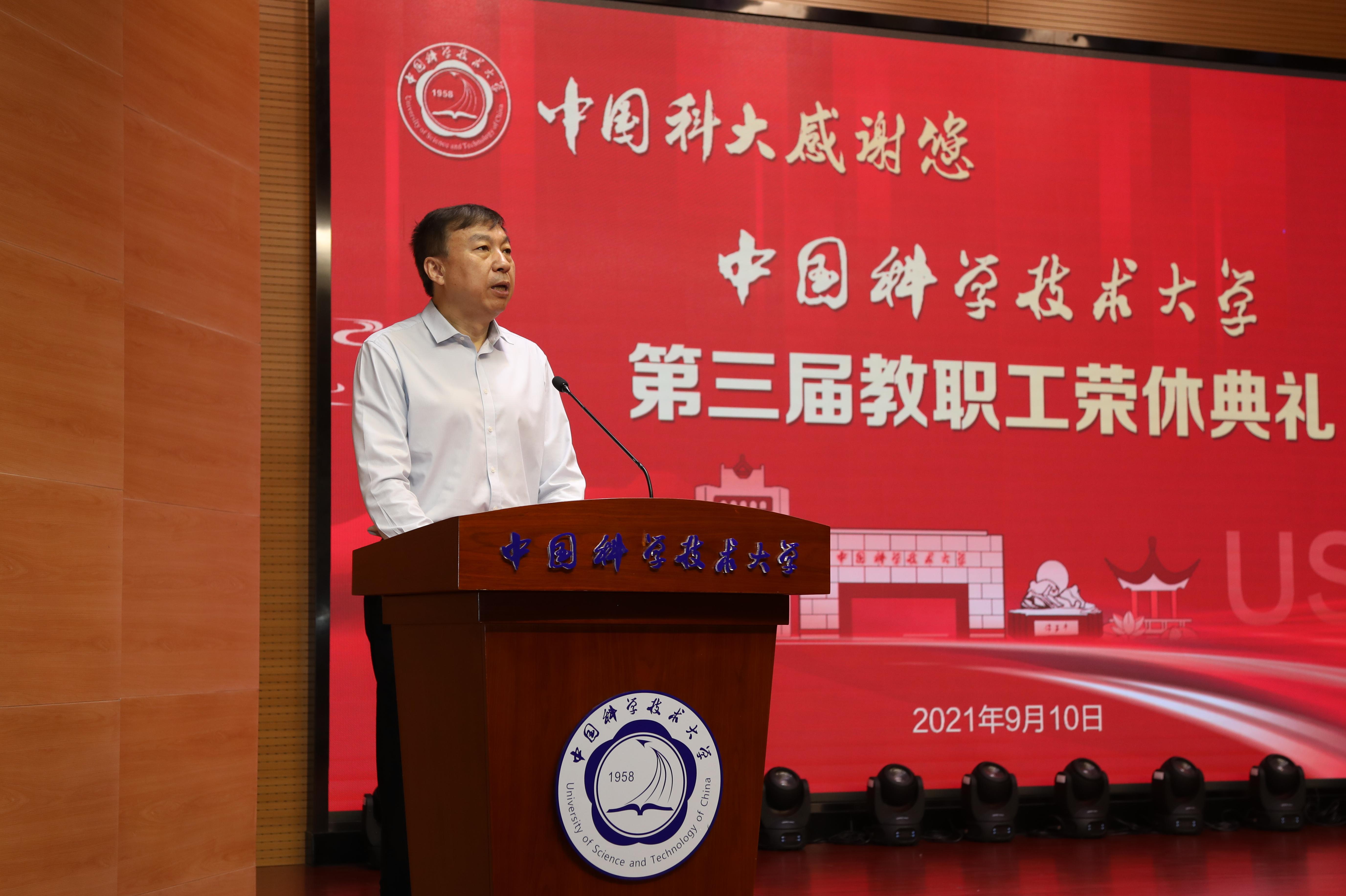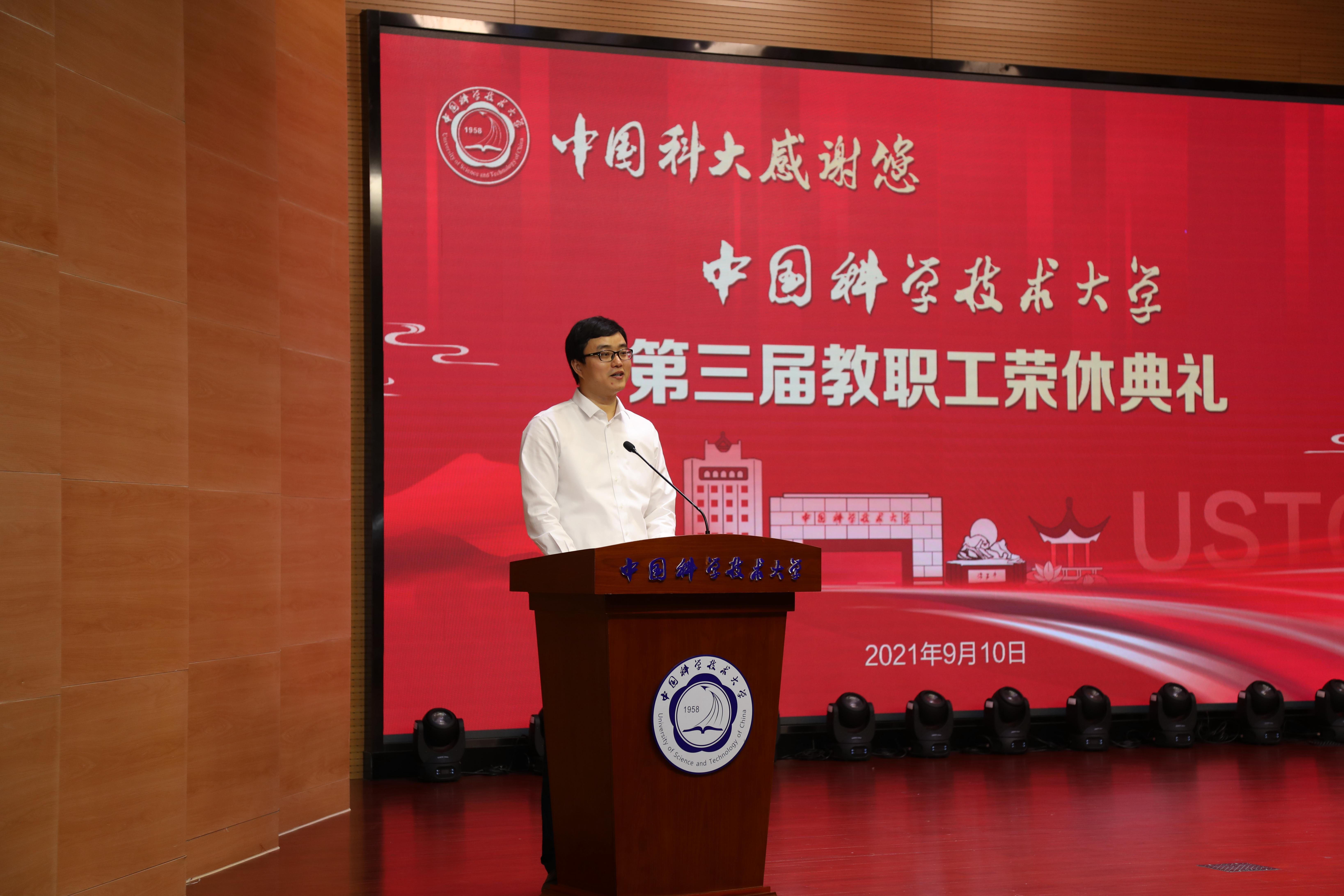 校党委书记舒歌群代表学校向全体教职工致以节日的问候,向2020年度光荣退休的60名教职工致以崇高敬意和衷心感谢。他说,今日科大之成就,源自大家昔日的辛勤与努力。学校会感恩、会铭记在这里奋斗过、拼搏过、奉献过的每一位教职工。习近平总书记指出“一个人遇到好老师是人生的幸运,一个学校拥有好老师是学校的光荣,一个民族源源不断涌现出一批又一批好老师则是民族的希望”。荣休老师们不仅是好老师,更是中国科大的光荣,是中国科大的骄傲。
