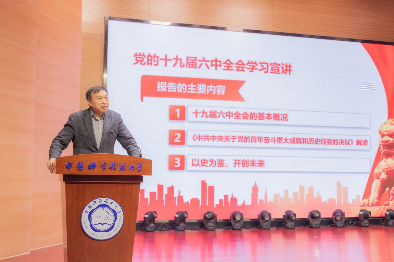12月22日下午,中国科学技术大学学习贯彻党的十九届六中全会精神宣讲团团长、校党委书记舒歌群在水上报告厅为物理学院和化学与材料科学学院师生作党的十九届六中全会精神学习宣讲报告。物理学院、化学与材料科学学院党员同志、师生代表共同聆听了报告,宣讲会由化学与材料科学学院党委书记、副院长闫立峰主持。