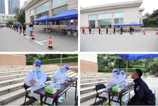 14:25,大礼堂前应急核酸采样区设置完毕。校医院安排采样人员,与物资存放区工作人员对接,领取防疫物资,穿戴好防护用品,进行应急核酸采样工作。物业公司通知管控区人员做好个人防控,进入应急核酸采样区,保持间隔,有序排队进行核酸检测。