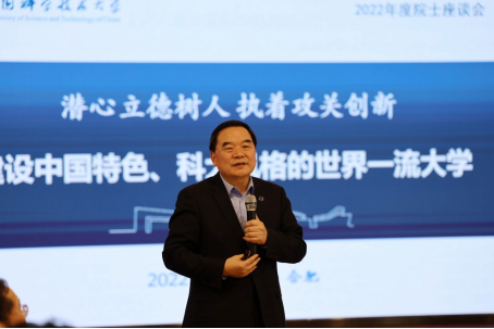 包信和作题为《潜心立德树人、执着攻关创新,建设中国特色、科大风格的世界一流大学》的报告,向与会院士详细介绍了学校在人才培养、科学研究、社会服务、国际合作、师资队伍等方面的工作进展和发展思路。他指出,学校发展方向要与国家发展目标相契合,要“心怀国之大者”,做好国家人、心系国家事、肩扛国家责,为国家与社会贡献科大力量。他感谢院士们对学校各项工作的关心与支持,希望院士们围绕学校建设发展积极建言献策,继续共同把学校越办越好。
