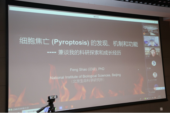 座谈会结束后,举行“中科大医学英才大讲堂”启动仪式暨中国科学院院士、北京生命科学研究所资深研究员邵峰学术报告会。包信和宣布“中科大医学英才大讲堂”启动,并向报告专家邵峰院士赠送“中科大医学英才大讲堂纪念牌”。邵峰院士作题为《细胞焦亡的发现、机制和功能:兼谈我的科研探索和成长之路》的学术报告。中国科学院院士、临床医学院院长卞修武和生医部部长程临钊线上参加报告会,临床医学院执行院长翁建平主持报告会。