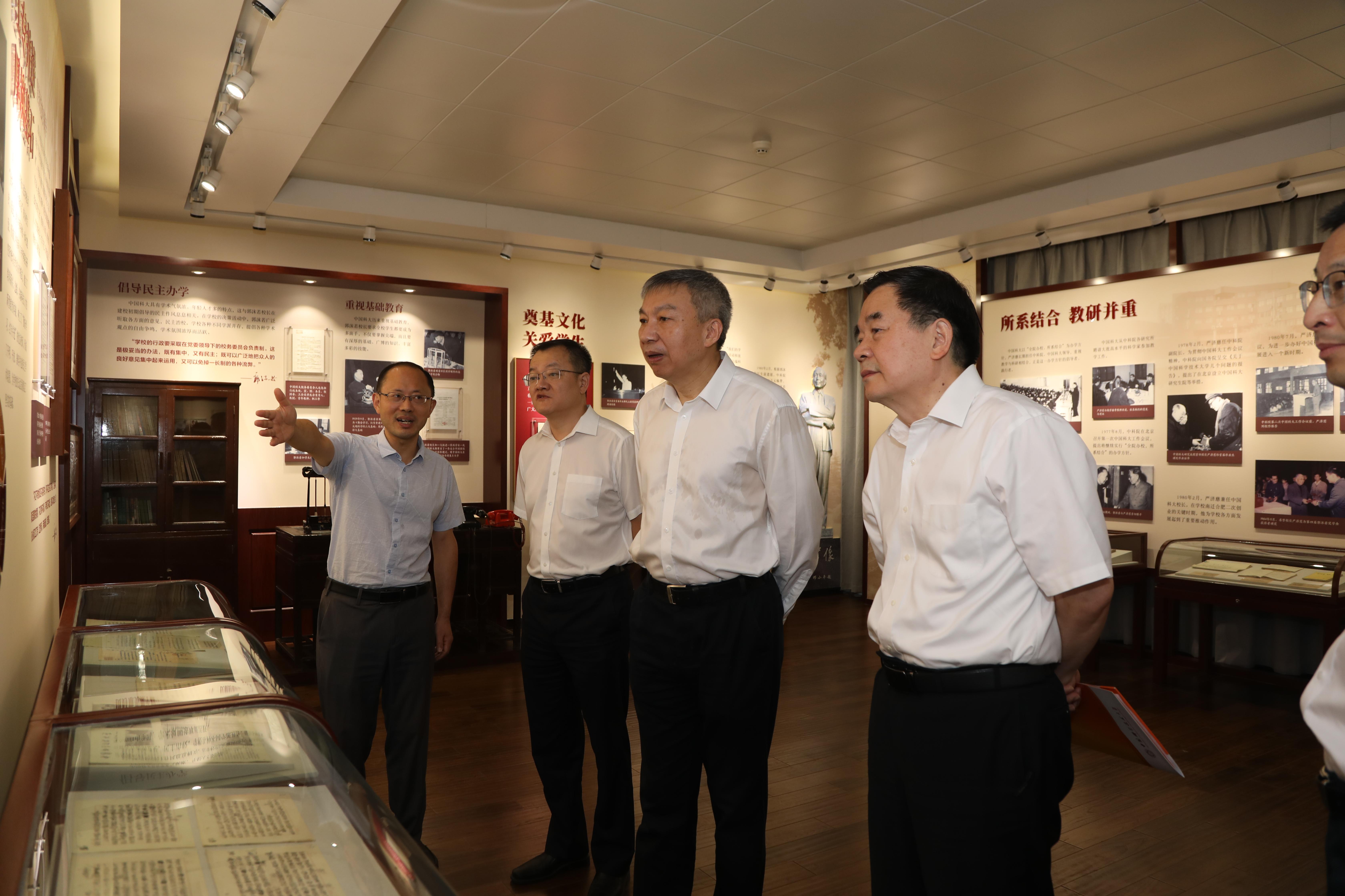 舒歌群强调,郭沫若是中国科大的主要创建者之一,他在担任中国科大首任校长的二十年间,明确了“贯彻党的教育方针”的办校根本原则和“全院办校、所系结合”的办学方针。他在中国科大成立暨开学典礼上提出的“三纲五化”的办学思想,为学校的蓬勃发展奠定了坚实基础,并且直到今天仍然得到了很好的继承和发扬。严济慈作为学校第二任校长,直接参与了学校创建与发展,领导了学校南迁合肥后的重建工作,推动少年班、研究生院、国家同步辐射实验室等的创建,使学校在二次创业中迅速崛起、重振辉煌。两位老校长深刻塑造了中国科大的精神底蕴和校园文化,希望全校师生能利用好这个纪念室,不断提升对学校的认同感与荣誉感,大力弘扬老一辈科学家、革命家精神,以实际行动再创新的辉煌。